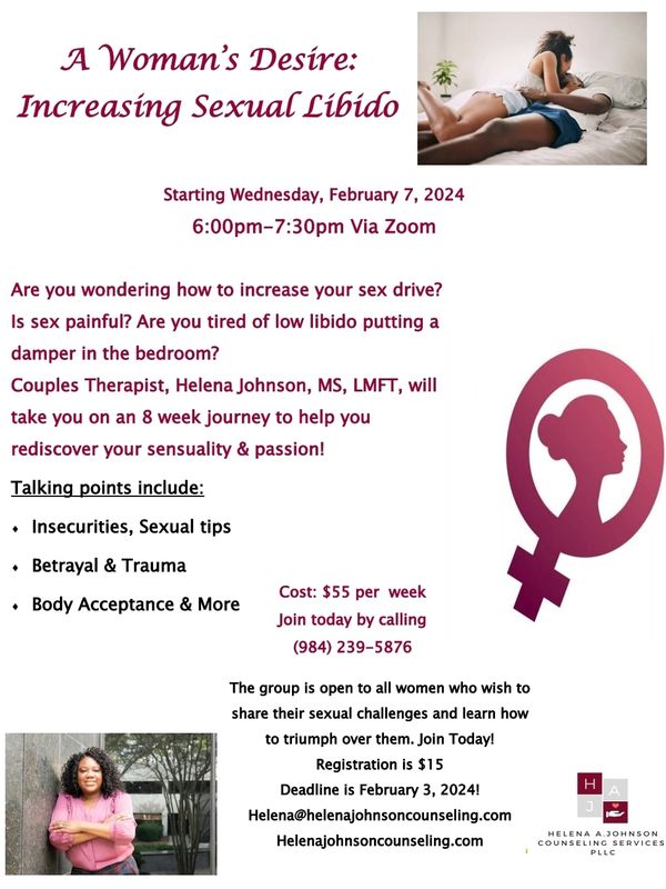 Helena A. Johnson Counseling Services, PLLC is happy to again present, "A Woman's Desire: Increasing Sexual Libido" Group Therapy starting February 1, 2023!! You won't want to miss the fabulous guest speakers on board!